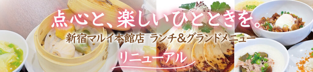 【新宿店マルイ本館店】メニューリニューアルのお知らせ 点心と、楽しいひとときを。DimDimSum 新宿マルイ本館店では、ランチおよびグランドメニューを2026.3.2より一部リニューアルいたしました。いつものお食事が、少し心はずむ時間になるように。より選ぶ楽しさが広がるラインナップへと進化しています。 ランチメニュー全ランチに「揚げ麻婆豆腐」が付き、満足感がさらにアップしました。外はカリッと、中はとろり、ピリッとあと引く美味しさをお楽しみいただけます。プレミアムランチの選べるメインは・塩豚ピータン入り香港粥・香港風炒麺・温玉のせ香港叉焼飯その日の気分に合わせてお選びいただけます。お粥ランチは「塩豚ピータン入り香港粥」or「鶏とキノコの香港粥」、麺ランチは「香港風ぷりぷり海老雲呑麺」or「香港風炒麺」、新たにスタートの「ご飯ランチ」は「温玉のせ香港叉焼飯」or「香港風唐揚げライス」をご用意しました。グランドメニュー新しく仲間入りしたのは・香港漁師風鶏唐揚げ・香港風鶏唐揚げ(ソースが2種よりお選びいただけます)・香港風炒麺さらに、・湯葉巻きオイスターソース蒸し・季節野菜のバーニャカウダせいろ蒸し・絶品スパイシーソースチキンがグランドメニューに加わりました。 新しくなったDimDimSum 新宿マルイ本館店で、本場香港の点心をゆったりとお楽しみください。皆さまのご来店を心よりお待ちしております。